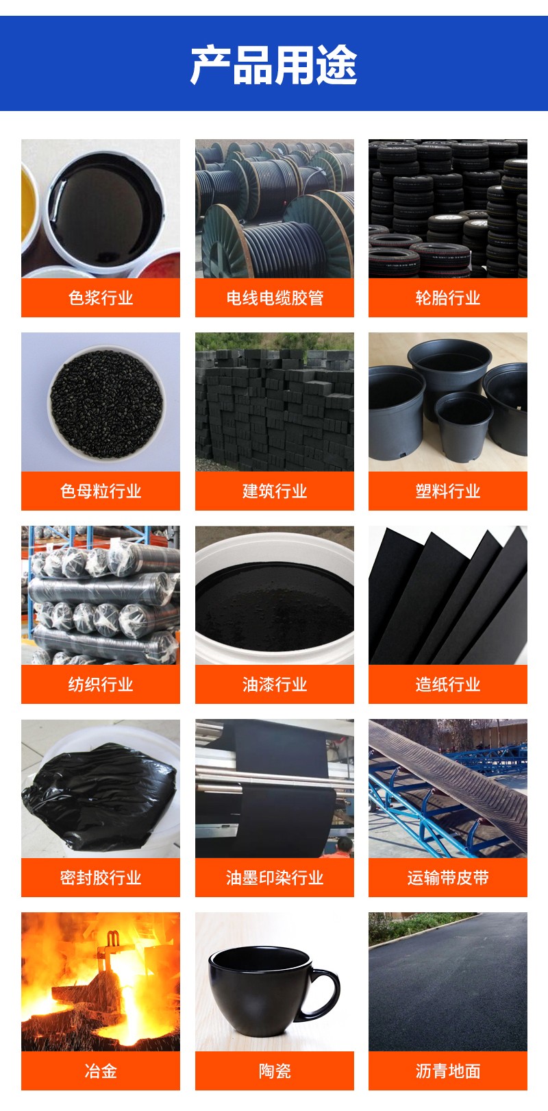 主要应用于印刷油墨、合成皮革、电线电缆、涂料等领域。广泛适用于各种印刷油墨、工业涂料、水性色浆、塑胶色母、PE色母、PP色母、ABS色母、PVC色母、EVA色母等。